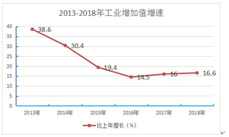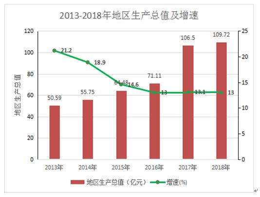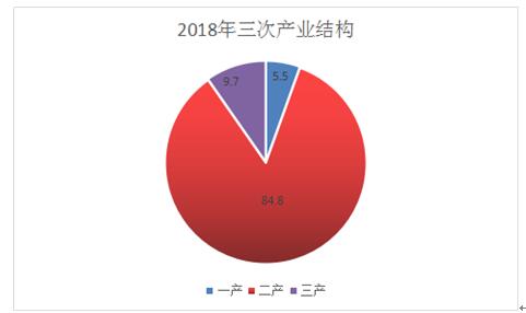 初步核算,经省、市统计局评估,全年实现地区生产总值109.72亿元,同比增长13.0%。其中,第一产业增加值5.98亿元,增长3.0%;第二产业增加值93亿元,增长16.6%;第三产业增加值10.74亿元,增长7.9%。三次产业的结构比由2017年6.9:84:9.1变化为5.5:84.8:9.7。图一