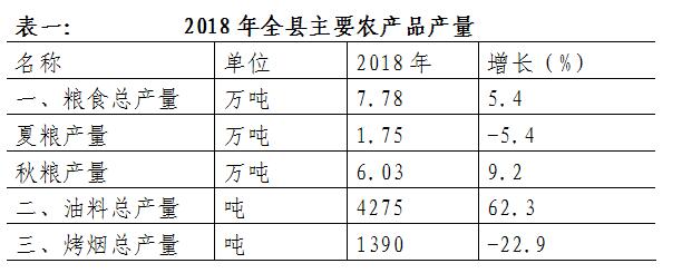 种植业总产值4.96亿元,增长3.2%。全年粮食作物播种面积32.75万亩,比上年下降0.3%,粮食总产量达到7.28万吨。其中夏粮面积11.86万亩,总产量为1.75万吨;秋粮面积20.89万亩,总产量为6.03万吨。蔬菜种植面积4.49万亩,增长23.8%。烤烟种植面积0.9万亩,总产量为1390吨。油料作物种植面积2.67万亩,总产量4275吨(表一)。