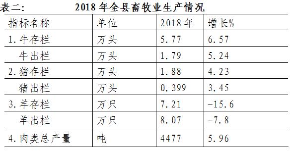畜牧业总产值4.09亿元,增长3.6%。全年肉类总产量4477吨,增长5.96%。(表二)。
