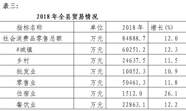 完成社会消费品零售总额84888.7万元,比上年增长12.0%,其中,城镇完成消费品零售额60251.2万元,增长12.3%,乡村完成消费品零售额24637.5万元,增长11.5%。