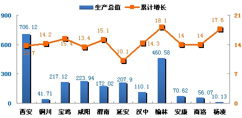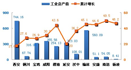 一季度,全省规模以上工业实现增加值1116.23亿元,增长17.5%;实现总产值2915.67亿元,增长31%。十市一区中,商洛、杨凌和榆林增长最快,增速分别达到49.5%、46.2%和45.1%;西安和延安增长缓慢,分别为17.6%和20%,排名最末。与去年同期相比,有6个区市增速加快,其中铜川和榆林增速增幅最大,分别加快10.4和8.1个百分点;有4个区市增速减缓,其中咸阳减辐最多,达到3.4个百分点。从绝对值看,西安、榆林和咸阳名列三甲,工业累计总产值分别为744.16亿元、560.19亿元和355.56亿元。