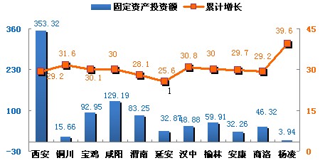 一季度,全省完成固定资产投资(不含农户)1012.28亿元,增长28.3%,增速高于全国3.3个百分点。其中,第一产业投资23.74亿元,增长67.4%;第二产业383.93亿元,增长40.9%;第三产业604.61亿元,增长20.4%。十市一区中,杨凌、铜川和汉中增长最快,以39.6%、31.6%和30.8%的增速排名前三位;延安以25.6%的增速排名最后。与去年同期相比,有3个区市增速加快,分别是杨凌、宝鸡和西安,增速分别加快6.4、1.7和0.4个百分点;其余区市增速均小幅减缓。从绝对值看,名列前三位的是西安(353.32亿元)、咸阳(129.19亿元)和宝鸡(92.95亿元)。