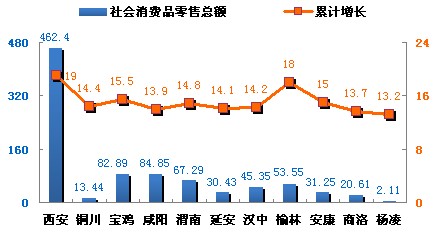一季度,涨价因素及国家房产新政对居民消费形成较大抑制作用,十市一区消费市场热度有所下降。全省社会消费品零售总额894.17亿元,增长17%。其中,城镇实现零售额782.12亿元,增长17.8%;乡村实现零售额112.05亿元,增长12.3%。从增速看,西安和榆林表现突出,以19%和18%的增速名列第一、二位;杨凌(13.2%)、商洛(13.7%)和咸阳(13.9%)排名最后三位。与去年同期相比,十市一区仅有榆林增速加快,增幅为3.6个百分点;其余区市增速均减缓,有5个区市增速减辐达10%以上,分别是铜川、宝鸡、商洛、安康和咸阳。从绝对值来看,西安(462.4亿元)居于首位,超过全省消费品零售总额的一半,咸阳(84.85亿元)和宝鸡(82.89亿元)分列二、三位。