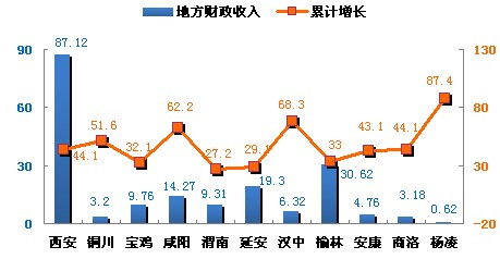 一季度,全省财政总收入531.37亿元,同比增长40.8%,增速比上年同期提高7.3个百分点;地方一般预算收入267.18亿元,增长40.8%,增速同比提高10.5个百分点。十市一区中,杨凌、汉中和咸阳增长最快,以87.4%、68.3%和62.2%的增速排名前三;渭南(27.2%)和延安(29.1%)增长较慢,排名倒数两位。与去年同期相比,有7个区市增速加快,延安增幅最大,达到30.6个百分点;有4个区市增速减缓,杨凌减幅最大,达到30.5个百分点。从绝对值来看,名列前三位的分别是西安(87.12亿元)、榆林(30.62亿元)和延安(19.3亿元)。