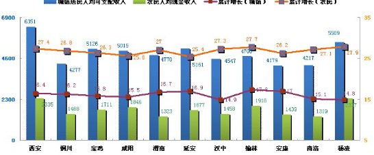 一季度,城乡居民收入快速增长,农村增速快于城镇。全省城镇居民人均可支配收入4881元,同比增长14.8%,实际增长9.2%;农村居民人均现金收入1616元,同比增长29.2%,实际增长20.3%,分别高于城镇14.4和11.1个百分点。从增速看,城镇居民人均可支配收入排名前三位的是榆林(17.3%)、安康(17%)和延安(16.9%),农村居民人均现金收入排名前三位的是杨凌(27.9%)、榆林(27.7%)和西安(27.4%)。与去年同期相比,十市一区城乡居民收入增速均加快,农村(平均加快11.4个百分点)增速增幅远远大于城镇(平均加快3.2个百分点),城镇居民人均可支配收入增速增幅最大的是榆林,增速加快了5.2个百分点;农村居民人均现金收入增速增幅最大的是汉中,增速加快了12.6个百分点。从绝对值来看,城镇居民人均可支配收入排名前三位的分别是西安(6351元)、杨凌(5509元)和延安(5161元),农村居民人均现金收入排名前三位的分别是杨凌(2337元)、西安(2335元)和榆林(1916元)。