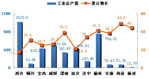 4月,受国家宏观调控、市场不稳定因素以及去年基数较高等诸多因素影响,全省规模以上工业生产出现回落,这是工业经济由实施刺激计划后的明显回升转向平稳增长的正常现象,也是结构调整压力加大的必然结果。当月全省完成规模以上工业总产值1061.61亿元,比上年同期增长24.4%,1-4月累计完成3970.02亿元,增长28.8%;当月实现工业增加值401.43亿元,增长11.5%,累计实现1510.44亿元,增长15.3%,增速较一季度回落2.2个百分点。十市一区中,商洛、杨凌和榆林以48.8%、44%和41.2%的增速排名前三位,西安增速仍排名最后,为17.2%。去一季度相比,仅有铜川和延安增速加快,其余9个区市增速出现回落,其中安康增速降幅最大,达到6.4个百分点。与去年同期相比,除杨凌外,其余区市增速均回落,延安、咸阳、榆林和西安增速降幅均超过20%。从绝对值看,西安、榆林和咸阳名列三甲,工业累计总产值分别为1015.8亿元、754.03亿元和491.66亿元。