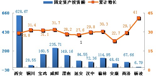 1-4月,全省固定资产投资1756.85亿元,同比增长28.5%,增速环比加快0.2个百分点。从增速看,杨凌、咸阳和铜川位列前三位,增速分别为41%、31.7%和31.4%;安康增长最慢,增速为22.7%。与上月相比,有6个区市增速加快,咸阳增速增幅最大,达到1.7个百分点;有5个区市增速减缓,安康增速减幅最大,达到7个百分点。从绝对值看,名列前三位的是西安(628.67亿元)、咸阳(235.71亿元)和宝鸡(160.5亿元)。
