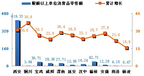 1-4月,全省限额以上单位累计实现消费品零售额609.43亿元,同比增长29.1%,比上年同期提高0.8个百分点;4月份,全省限额以上单位实现消费品零售额156.66亿元,同比增长28%。十市一区中,铜川、西安和渭南消费增长最快,增速分别达到36.8%、30.6%和28.4%,位列前三位;杨凌增长最慢,增速仅为15.5%。去上月相比,所有区市增速加快,有6个区市增速增幅超过10个百分点,其中铜川增速加快了22.4个百分点,增幅最大。从绝对值来看,西安(419.33亿元)居于首位,占到全省限额以上单位社会消费品零售总额的68.8%,榆林(42.71亿元)和宝鸡(39.71亿元)分列二、三位。