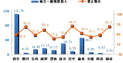 1-4月,全省完成财政总收入795.29亿元,增长45.6%,增速同比加快15.4个百分点,较一季度加快4.8个百分点;地方一般预算性收入415.09亿元,增长53.2%,同比加快24.4个百分点,较一季度加快12.4个百分点。从增速看,汉中、杨凌和铜川以64.8%、63.2%和62.4%的增速排名前三位,渭南以27.4%的增速排名最后。与上月相比,有5个区市增速加快,其中铜川和榆林增速增幅超过10个百分点;有6个区市增速减缓,其中杨凌增速减幅最大,达到24.2个百分点。与去年同期相比,除安康增速减缓24个百分点外,其余区市增速均加快,有5个区市增速增幅超过30%,其中铜川增幅最大,达到42个百分点。从绝对值来看,名列前三位的分别是西安(111.79亿元)、榆林(46.1亿元)和延安(29.73亿元)。