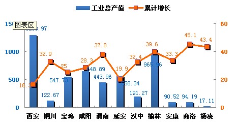 5月,全省实现工业总产值1155.36亿元,增长29.4%;规模以上工业实现增加值451.91亿元,增长15.9%。1-5月,实现工业总产值5134.79亿元,增长29.1%;规模以上工业实现增加值1991.71亿元,增长15.5%。从增速看,商洛(45.1%)、杨凌(43.4%)和榆林(39.6%)排名前三位,西安(16.3%)和延安(19.9%)增速不及20%,排名在最后2位。去1-4月相比,仅有铜川、咸阳和宝鸡增速加快,分别加快2.5、2.1和0.3个百分点;其余区市增速均有回落,其中安康增速降幅最大,达到4.9个百分点。从绝对值看,西安、榆林和咸阳名列三甲,工业累计总产值分别为1293.97亿元、965.96亿元和648.89亿元。