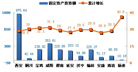 1-5月,全省固定资产投资2751.68亿元,同比增长28.4%。从增速看,杨凌、咸阳和宝鸡排名前三位,增速分别达到40.8%、31.4%和31.3%;安康增长最慢,增速为26.8%。与1-4月相比,仅有安康、渭南和宝鸡增速加快,分别加快4.1、0.8和0.2个百分点;其余区市增速稍有回落。从绝对值看,名列前三位的是西安(975.64亿元)、咸阳(353.61亿元)和宝鸡(236.82亿元)。