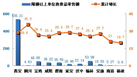 1-5月,全省限额以上企业(单位)累计实现消费品零售额775.49亿元,增长28%,比1-4月回落1.1个百分点;5月份,全省限额以上企业(单位)实现消费品零售额166.27亿元,同比增长23.7%,比4月回落4.3个百分点。十市一区中,铜川、延安和西安消费增长最快,增速分别达到35.5%、28.7%和28.6%,位列前三位;杨凌增长最慢,增速仅为19.7%。去1-4月相比,有5个区市增速加快(汉中、杨凌、咸阳、延安、宝鸡)、5个区市增速回落(西安、铜川、商洛、榆林、安康)、1个区市增速持平(渭南)。从绝对值来看,西安(535.21亿元)居于首位,占到全省限额以上企业(单位)社会消费品零售总额的69%,榆林(53.99亿元)和宝鸡(48.85亿元)分列二、三位。