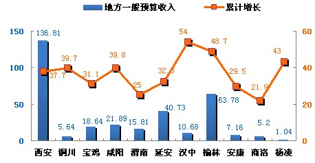 1-5月,全省完成财政总收入1044.65亿元,增长51.1%,增幅比上年同期提高19.3个百分点,比1-4月提高5.5个百分点;地方一般预算性收入563.79亿元,增长61.4%,增幅比上年同期提高28.3个百分点,比1-4月提高8.2个百分点。十市一区中,汉中、榆林和杨凌以54%、48.7%和43%的增速排名前三位,商洛以21.9%的增速排名最后。与1-4月相比,仅有榆林和延安增速加快,分别加快5.3和0.4个百分点;其余区市增速均回落,其中铜川和杨凌增速降幅最大,达到22.7和20.2个百分点。从绝对值来看,名列前三位的分别是西安(136.81亿元)、榆林(63.78亿元)和延安(40.73亿元)。