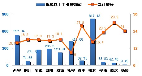 1-7月,全省规模以上工业企业累计完成工业增加值2947.47亿元,同比增长16.7%,增速较上半年回落0.3个百分点。其中,7月份,规模以上工业实现增加值443.17亿元,同比增长14.95%。从增速看,商洛(29.9%)、汉中(27.8%)和杨凌(24%)位列前三位,延安(9%)增速排名仍居最后。去上半年相比,有4个区市增速加快,分别是延安、咸阳、安康和杨凌,分别加快0.8、0.5、0.2和0.1个百分点;有6个区市增速减缓,分别是渭南、商洛、宝鸡、汉中、榆林和西安,分别减缓0.1、0.1、0.2、0.2、0.2和0.4个百分点。从绝对值看,榆林、西安和延安名列三甲,工业增加值分别为817.43亿元、527.34亿元和418.08亿元。