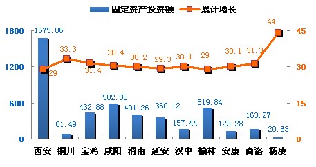 1-7月,全省固定资产投资4884.05亿元,同比增长29.1%。从增速看,杨凌、铜川和宝鸡排名前三位,增速分别达到44%、33.3%和31.4%;延安、西安和榆林增速不及30%,排名后三位。与上半年相比,有铜川、渭南、商洛和延安4个区市增速加快,分别加快1、0.6、0.4和0.1个百分点;其余7个区市增速均小幅回落。从绝对值看,名列前三位的是西安(1675.06亿元)、咸阳(582.85亿元)和榆林(519.84亿元)。