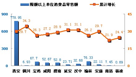 1-7月,全省限额以上企业(单位)累计实现消费品零售额1122.22亿元,增长29.1%,比上半年提高0.6个百分点;7月份,全省限额以上企业(单位)实现消费品零售额173.98亿元,同比增长32.7%。十市一区中,铜川、延安和汉中消费增长最快,增速分别达到34.3%、31.1%和31.1%,位列前三位;商洛增长最慢,增速为21.9%。去1-5月相比,除宝鸡和铜川2个区市增速回落0.1和0.2个百分点外,其余9个区市增速均加快,其中杨凌、汉中和延安增速增幅最大,分别加快了4.7、3.7和2.4个百分点。从绝对值来看,西安(778.95亿元)居于首位,超过全省限额以上企业(单位)社会消费品零售总额的一半,榆林(76.33亿元)和宝鸡(67.7亿元)分列二、三位。