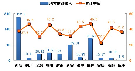 1-7月,全省完成财政总收入1715.57元,增长62.2%,增幅比上年同期提高33.1个百分点;地方一般预算性收入1053.3亿元,增长95.9%,增幅比上年同期提高68.1个百分点。十市一区中,榆林、铜川和咸阳以46.8%、46.6%和45.2%的增速排名前三位,安康以22.5%的增速排名最后。与上半年相比,除延安和汉中增速加快5.4和1.6个百分点外,其余区市增速均回落,其中榆林增速降幅最大,达到3.4个百分点。从绝对值来看,名列前三位的分别是西安(192.9亿元)、榆林(99.68亿元)和延安(69.01亿元)。