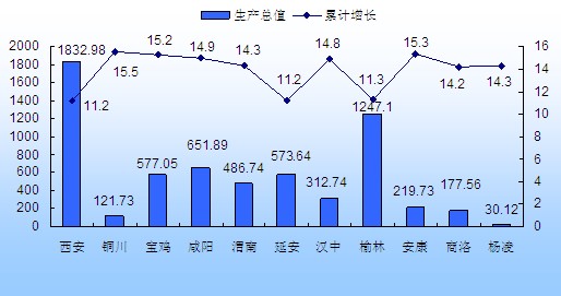 上半年,全省实现生产总值6116亿元,同比增长13%,与一季度持平,比上年同期回落0.7个百分点,高出全国平均水平5.2个百分点。从增速看,铜川、安康和宝鸡名列前三,分别为15.5%、15.3%和15.2%;延安和西安以11.2%的增速并列位末。与一季度相比,铜川、宝鸡、渭南、榆林和安康5市增速未变,咸阳和商洛两市增速下降,分别下降0.1和0.6个百分点,其余4个增速加快的区市中,延安和汉中增幅稍大,各加快1.6和1.1个百分点。从绝对值看,西安和榆林以1832.98和1247.10亿元排名前两位,占到全省生产总值的50.36%。