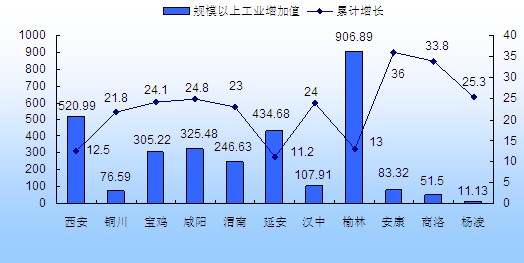 1-6月份,全省规模以上工业实现增加值3138.24亿元,同比增长17%,与一季度保持一致。十市一区中,安康(36%)和商洛(33.8%)增速超过了30%,排名前两位;西安(12.5%)和延安(11.2%)位居最后,其余区市增速都在20%至30%之间。与一季度相比,有7个区市增速加快,铜川、延安、汉中和渭南增速排名前四位,分别加快1.8、1.7、1.7和1.5个百分点;增速下降的4个区市中,咸阳下滑幅度最大,降幅为2.6个百分点。从绝对值看,榆林以906.89亿元位居第一,西安以520.99亿元位居第二。