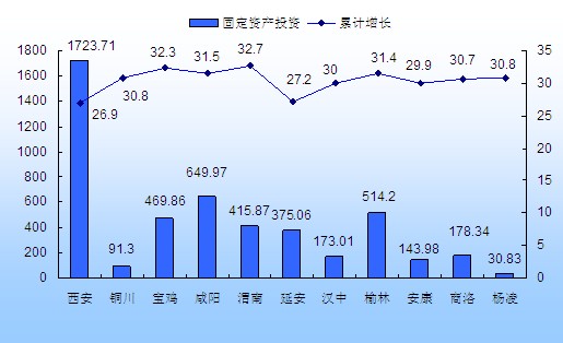 上半年,全省完成固定资产投资5005.13亿元,同比增长27.3%,比去年同期减缓2个百分点,较一季度加快0.3个百分点。十市一区投资增速差异不大,渭南(32.7%)、宝鸡(32.3%)和咸阳(31.5%)增长较快,安康(29.9%)、延安(27.2%)和西安(26.9%)增长较慢。与一季度相比,8个区市增速有所加快,但增幅较小,都在1个百分点以内;延安、宝鸡和咸阳增速放缓,分别下降3.1、0.1和0.1个百分点。从绝对值看,西安、咸阳和榆林完成投资额最多,分别为1723.71、649.97和514.20亿元。