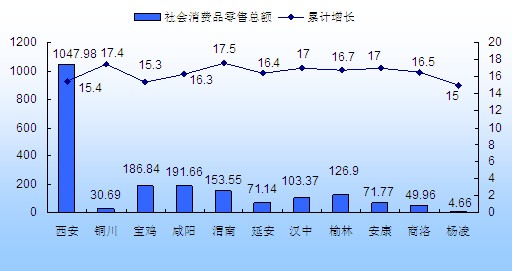 1-6月份,全省社会消费品零售总额2038.52亿元,同比增长15.9%,较上年同期下降1.8个百分点,较一季度下降0.4个百分点。十市一区消费增速基本在16.5%左右波动,渭南和铜川增长最快,增速分别为17.5%和17.4%;宝鸡和杨凌增速最低,各自为15.3%和15.0%。与一季度相比,只有宝鸡增速加快,增幅为0.3个百分点;其余10个区市增速有所减缓,降幅最大的为杨凌,下降1.7个百分点,其次为咸阳、延安和榆林,均下降1.1个百分点,西安增速下滑幅度最小,为0.2个百分点。从绝对值看,西安、咸阳和宝鸡位居前三,消费品零售总额分别为1047.98、191.66和186.84亿元,占全省总额的70%。