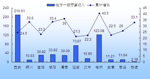 上半年,全省完成财政总收入1435.56亿元,同比增长20.1%;实现地方财政收入793.30亿元,增长26.6%,比去年同期下降80.6个百分点,较一季度下滑3个百分点,高出全国水平12.2个百分点。从增速看,榆林(40.5%)、渭南(36.0%)和铜川(33.6%)排名前三,汉中(22.2%)和延安(21.3%)位居最后。与一季度相比,有7个区市增速上升,杨凌和铜川增长最快,分别上升17和15.5个百分点,商洛增幅最小,为0.7个百分点;4个区市增速下降,延安和榆林回落幅度最大,分别下降39.8和25.8个百分点。从绝对值看,西安和榆林分别以210.61和123.08亿元领先,其他市区一般性预算收入都在百亿元以下。