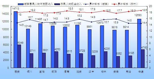1-6月,我省城镇居民人均可支配收入为10684元,同比增长14.3%,比一季度回落2个百分点,比上年同期回落1.3个百分点;农村居民人均现金收入为3556元,增长17.6%,比一季度加快2.3个百分点,较去年同期下降7.7个百分点。十市一区中,安康(15.9%)和延安(15.8%)城镇居民收入增速排名前两位,商洛(14.5%)和杨凌(14.4%)名列最后;各区市农村居民收入增速在17.7%至18.6%之间波动,其中,杨凌增速最高,安康增速最低。与一季度相比,十市一区城镇居民收入增速全部出现回落,渭南降幅最大,下降2.5个百分点,榆林降幅最小,下滑1.9个百分点;农村居民人均现金收入增速全部加快,增幅在2.3至2.6个百分点之间。从绝对值来看,城镇居民人均可支配收入排名前三位的是西安、杨凌和宝鸡,分别为14713、12693和11485元;农村人均现金收入位居前三位的是西安、杨凌和咸阳,分别为6049、4760和4250元。(摘自陕西信息中心)