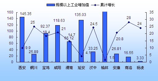 1-2月,全省规模以上工业企业实现增加值976.7亿元,同比增长13.2%,低于去年同期4.1个百分点。从增速看,商洛、铜川和汉中分别以28%、25%和24.5%的增幅名列前三,西安、延安和榆林以9.9%、4.1%和1.5%的增速位居最后,三者低于10%。与去年同期相比,有7个市增速下降,安康和榆林增速下滑幅度最大,分别下滑了14.7和13.8个百分点;渭南、铜川、汉中和宝鸡增速加快,分别提升了5.7、5.7、3.5和0.4个百分点。从绝对值看,榆林、西安和延安名列前三位,规模以上工业增加值分别为251.0、145.35和135.03亿元。