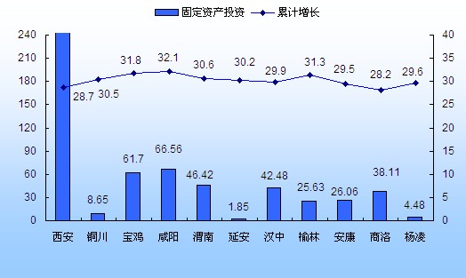 1-2月,全省完成固定资产投资593.05亿元,同比增长28.3%,增速比去年同期回落0.3个百分点。从增速看,咸阳(32.1%)、宝鸡(31.8%)、榆林(31.3%)增长最快,安康(29.5%)、西安(28.7%)、商洛(28.2%)排名最后三位。与去年同期相比,有6个市固定资产投资增速加快,铜川和榆林增幅超过了1个百分点,分别加快1.5和1.4个百分点;其他5个区市增速下降,其中商洛降幅超过了1个百分点。从绝对值看,西安、咸阳、宝鸡名列前三位,分别为230.7、66.56和61.7亿元。