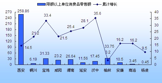 1-2月,全省限额以上企业实现消费品零售额423.40亿元,同比增长16.9%,增速比去年同期回落3.3个百分点。十市一区中,汉中、宝鸡、延安消费增长最快,增速分别达到35.6%、33.4%和28.1%;杨凌和榆林消费增长最慢,增速为9.5%和3.2%。与去年同期相比,宝鸡、汉中、咸阳、延安增速加快,分别上升了27、20.4、2.5、2个百分点;其他7个区市增速回落,榆林和铜川降幅相对较大,分别下滑了26.4和25.8个百分点。从绝对值来看,西安(258.86亿元)居于首位,榆林和宝鸡分别以33.75和31.33亿元的零售额紧跟其后。