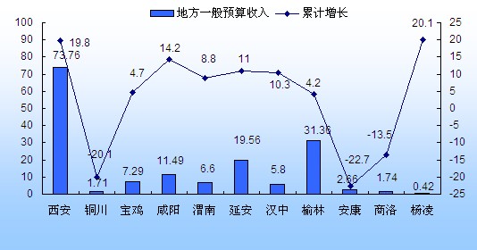 1-2月份,全省完成财政总收入426.34亿元,增长3.3%;实现地方一般预算性收入233.35亿元,增长5.7%。从增速看,杨凌(20.1%)、西安(19.8%)、咸阳(14.2%)增长最快,商洛(-13.5%)、铜川(-20.1%)和安康(-22.7%)三市增速不仅最慢,而且呈现负增长。与去年同期相比,除西安和杨凌增速加快,各提升14和13.1个百分点外,其他9个区市增速都出现下降,延安、榆林、安康和铜川降幅相对较大,分别下降了120.8、60.9、42.8和36.9个百分点。从绝对值看,一般预算收入排名前三的为西安(73.76亿元)、榆林(31.36亿元)和延安(19.56亿元)。(摘自陕西信息中心)