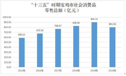 “十三五”时期,宝鸡商贸流通体制改革进一步深入,流通基础设施进一步完善,消费潜力活力进一步释放,新型消费快速发展,消费升级加快,全市社会消费品零售总额稳步增长,人民生活更加舒适便利,获得感进一步增加。