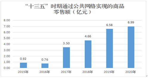 宝鸡电商企业快速发展,京东、天猫、淘宝、抖音各类平台均有宝鸡企业入驻,电商经营户数量激增,直播带货迅速走红,更多宝鸡名优特产搭上网络快车,白酒、方便食品、猕猴桃、红薯销售火爆。“十三五”末,实现全国电子商务进农村综合示范县在9个县全覆盖,累计建成7个县级电子商务服务中心,累计发展镇村电商物流线路15条,培育省、市电子商务示范企业20户,各县区在国家电商扶贫网开设县域特色馆13个,全市网商总数突破5万家,带动创业就业12.67万人。西凤酒入选国家首批“民族电商”品牌,蔡家坡被评为西北唯一“淘宝镇”,宝鸡擀面皮产业网销量突破40亿元,漂洋过海出口美国、英国、法国、日本、韩国等多个国家,宝鸡连续三年蝉联“全国优秀电子商务城市”。 2020年,全市网络交易额314.46亿元,其中零售额62.95亿元。限上单位通过公共网络实现商品零售6.99亿元,较2015年增加6.07亿元,增长659.8%,“十三五”期间年均增长50 %。
