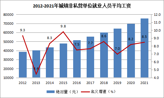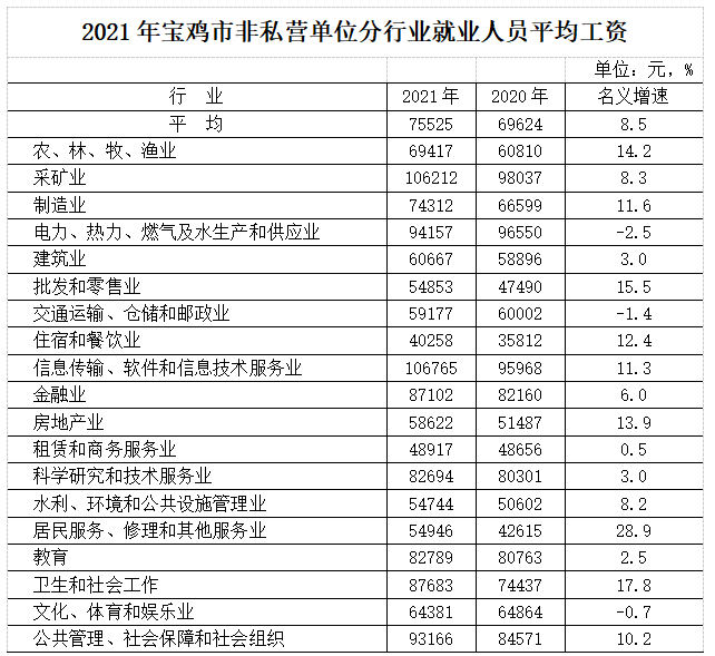 2021年宝鸡市非私营单位就业人员年平均工资为75525元,比上年增加5901元,同比增速名义增长8.5%,比2020提高0.3个百分点。扣除物价因素,2021年宝鸡市非私营单位就业人员年平均工资实际增长7.4%。