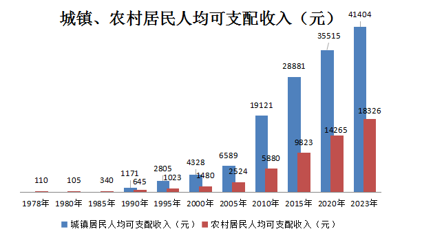 居民收入持续增加。在经济快速发展的带动下,全区居民共享发展成果,增收渠道不断拓宽,生活水平节节攀高。2023年,城镇居民人均可支配收入为41404元,是1986年的65.2倍,年均增长12.0%;2023年农村居民人均可支配收入为18326元,是1978年的166.6倍,年均增长12.0%。