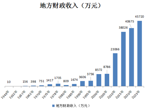 财政实力不断增强。财力的增强有力保障了全区各项社会事业的协调健康发展。2023年全区地方财政收入4.57亿元,是1949年的4572倍,年均增长12.1%;财政支出29.62亿元,是1949年的3291.1倍,年均增长11.6%。