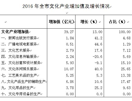 2016年,全市文化及相关产业(以下简称文化产业)实现增加值39.27亿元,增长13.0%(未扣除价格因素,下同),占地区生产总值比重2.03%,较2010年提高0.41个百分点。文化产业增加值总量较2010年增加了23.49亿元,年均增长16.4%。文化产业增加值总量位居全省第四,占全省文化产业增加值的4.9%。分行业看,文化制造业增加值11.20亿元,增长14.4%,占文化产业增加值比重28.5%;文化批发和零售业增加值6.25亿元,增长14.7%,占15.9%;文化服务业增加值21.82亿元,增长11.7%,占55.6%。按文化产品分,文化休闲娱乐服务实现增加值10.07亿元,增长40.0%,占全市文化产业增加值的25.65%,对全市文化产业增加值增长的贡献率达到64.0%;文化用品的生产实现增加值3.78亿元,增长25.2%,贡献率为16.9%;文化产品生产的辅助生产实现增加值6.86亿元,增长10.6%,贡献率为14.7%。