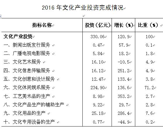 2016年,全市文化、体育和娱乐业投资56.88亿元,占全社会固定资产投资的比重为1.78%,比上年提升0.57个百分点。全市文化产业投资330.05亿元,增长1.21倍,占全市固定资产投资比重10.3%,比上年大幅提升4.5个百分点。十大类文化产品投资中五类增速超过1倍,其中,文化休闲娱乐服务投资额达到234.90亿元,增长1.37倍,占文化产业投资比重71.2%,是我市文化产业投资的主力;文化用品的生产投资25.18亿元,增长2.86倍;文化信息传输服务投资16.12亿元,增长2.51倍。