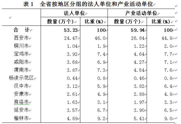 第四次经济普查数据显示,2018年末,全省法人单位为53.23万个,我市法人单位数为3.92万个,占全省法人单位数的7.4%,分别低于西安、榆林,位居全省第三,比2013年提升一个位次。全省产业活动单位数为59.94万个,我市产业活动单位数为4.64万个,占全省产业活动单位数的7.7%(详见表1)。