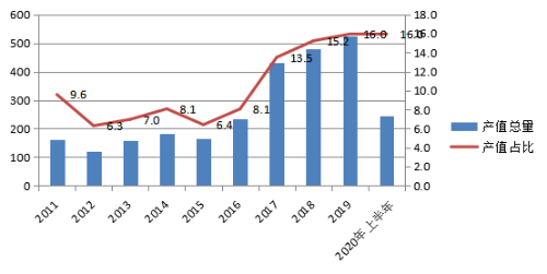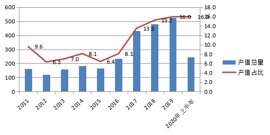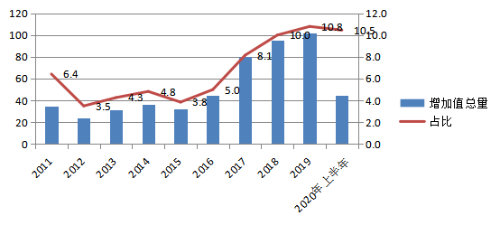 工业总产值反映了产业发展的总规模和总水平,而工业增加值则体现了产业发展的质量和对区域的贡献。2019年,汽车制造业实现增加值过百亿,较2011年增长3倍,占全市增加值总量的比重也由6.4%提高到10.8%。