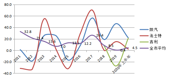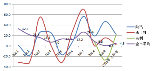 龙头企业的发展基本反映了汽车行业整体市场的变化,从近十年三大汽车制造龙头企业增速变化情况看,汽车制造业整体波动较大,基本呈周期性发展趋势,陕汽、法士特属于政策引导型,国家基建投资、房地产政策等因素对企业影响较大,而吉利汽车属于市场驱动型,除2019年技改停产时间长对全年影响较大外,投产后始终处于规模扩张态势。