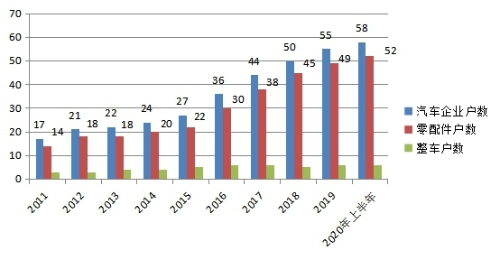 (1)企业户数大幅增长:截止2020年上半年,全市共有规模以上汽车及零配件企业58户,较2011年增长3.4倍,净增41户,其中整车(含特种车)生产企业6户,发动机生产企业1户,车身、挂车生产企业2户,汽车零配件生产企业49户,与2011年相比,零配件生产企业净增38户。自2016年吉利整车投产后,近30户规模以上汽车零配件企业入驻宝鸡,磁场效应不仅引来了省内零配件企业,更吸引来重庆宏立至信、宁波拓普、天津大焊、浙江铭博等优质企业落户,汽车零配件孵化基地、陆港高端汽车零部件产业园、泰华物流园等汽车产业园区也呈现多点开花局面。