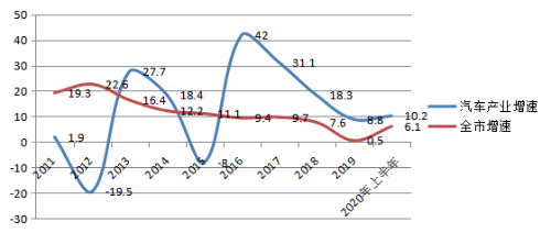 近十年宝鸡汽车制造业增加值增速与全市增速对比