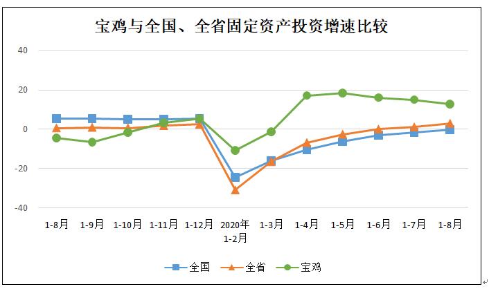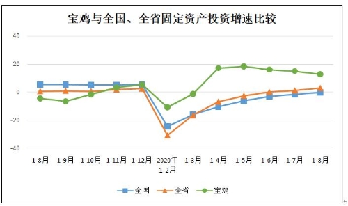 宝鸡市统筹推进疫情防控和经济社会发展各项工作,扎实做好“六稳”工作,落实“六保”任务,区域经济延续了前7个月以来的复苏势头,1-8月,宝鸡市固定资产投资同比增长12.6%,比去年同期提高17.1个百分点,比上月回落2.4个百分点,保持稳步增长趋势,增速位居全省第一,高出全省平均水平9.6个百分点,高于全国12.9个百分点。图一
