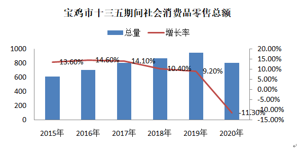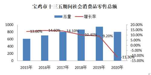 (三)消费品市场稳中有升。“十三五”期间居民收入大幅增长,群众消费水平有显著提升,服务新领域新业态层出不穷。创意设计、远程诊断、网上购物、网络约车、网上订餐、远程教育、数字家庭、智慧社区新服务模式加快普及,电子商务产业快速发展,实体商业经营业态纷纷转型,臊子面、擀面皮等特色食品在产业化发展上取得新突破。“十三五”时期,2020年宝鸡社会消费品零售总额达801.94亿元,是2015年的1.4倍。