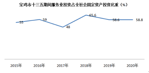 (三)服务业基础设施明显改善。“十三五”时期加大服务业投资力度,建成一大批服务业重大基础设施,宝坪、太凤、旬凤、眉太等高速公路快速推进,市文化艺术中心建成开放,高新区南山中学、渭滨中学、石油中学新校区建成投用,主城区和重点景区、大型场馆、交通枢纽等重点区域5G网络整体覆盖。聚力建设生产服务型国家物流枢纽承载城市和货物集散中心,实施阳平铁路物流基地二期、华誉智慧冷链物流园等项目,推进眉县国家骨干冷链物流基地建设。全市服务业投资占全市全社会固定资产投资比重不断提升,2020年达到58.8%,比“十二五”末提高3.8个百分点。