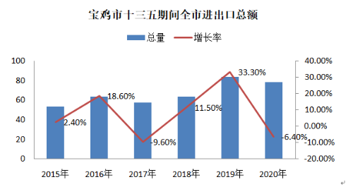 (四)宝鸡市对外贸易提质加速。“十三五”时期全市外贸领域不断拓展,规模不断扩大。宝鸡综合保税区通过国务院批复,中欧国际货运宝鸡专列正式开通。2020年共实施招商引资项目1079个,实际利用外资12916万美元,年内新设外商投资企业19户。2020年全年外贸进出口总额78.6亿元,比2015年增长46.4%,“十三五”期间年均增长7.9%。