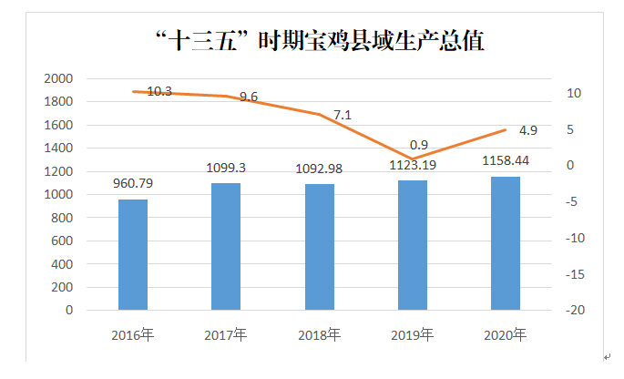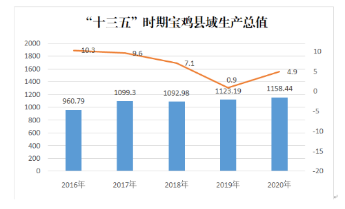 一是经济总量持续攀升。“十三五”时期,全市县域经济发展延续了“十二五”时期快速增长态势,经济总量不断攀升。2020年,全市县域生产总值达到1158.44亿元,是2015年的1.3倍,“十三五”时期年均增长6.5%,增速高于全市0.2个百分点。2020年,县域生产总值超过百亿的县达到5个,较2015年增加1个,其中凤翔区于2016年突破200亿元;麟游县生产总值较2015年实现翻番,太白县、千阳县、眉县、陇县、扶风县地区生产总值是2015年的1.5倍以上。“十三五”时期,麟游县年均增速超过10%,除凤县、陇县外其余各县年均增速均高于全市。