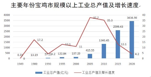 百年来,宝鸡从手工业起步,先后经历了轻工业(日用品)为主、轻重工业均衡发展、重工业占主导三个历史阶段。抗战初期的“迁厂运动”中,福新面粉厂、大新面粉厂、泰华毛纺厂、西北机器厂等15家企业先后在宝鸡落地生根,长乐塬抗战工业遗址更是时刻反映着炮火下织就的不屈民族精神。“一五”、“三线”建设时期,一大批国家投资和沿海内迁在宝建厂,这段时期,国家投资占宝鸡工业总投资的70%以上,逐渐形成了以机械、军工电子为重点的工业基地。改革开放至今,通过深化改革、调整结构、参与竞争,以重工业为主导的工业结构全面凸显,重工业总产值占全部工业产值的比重由1949年的10.2%上升到1978年的53.3%,截至2020年重工业产值占比达到74.9%。