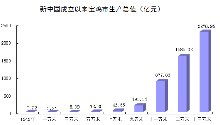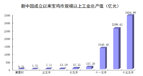 生产规模持续扩张。1949年,宝鸡仅74户小微工业企业,工业总产值仅0.31亿元;到1957年工业企业达到408户,工业总产值达到1.51亿元,首次超过农林牧渔业总产值;2020年末,全市规模以上工业企业达到823户,规模以下工业企业4000余户,全年完成规模以上工业总产值3434.9亿元,是1949年的11080倍,是1978年的252.8倍。1949-2020年,规模以上工业总产值年均增长14.0%。2020年,全市实现工业增加值1024亿元,达到1990年的54.4倍,期间年均增长14.3%。